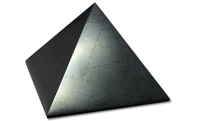 4 inch polished Shungite pyramid. The pyramid is a three dimensional shape and a symbol of human development, power and self worth. Secondary picture shows a polished and an mat finished pyramid for comparison display.